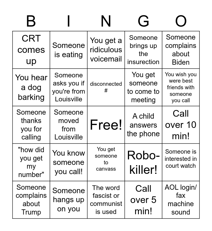This bingo card has a free space and 24 words: You know someone you call!, Someone hangs up on you, disconnected #, Someone complains about Trump, Someone complains about Biden, CRT comes up, You hear a dog barking, Someone is eating, A child answers the phone, You get someone to canvass, You get someone to come to meeting, Someone thanks you for calling, Robo-killer!, Someone is interested in court watch, Someone asks you if you're from Louisville, Call over 5 min!, Call over 10 min!, You get a ridiculous voicemail, You wish you were best friends with someone you call, Someone moved from Louisville, AOL login/ fax machine sound, "how did you get my number", Someone brings up the insurection and The word fascist or communist is used.