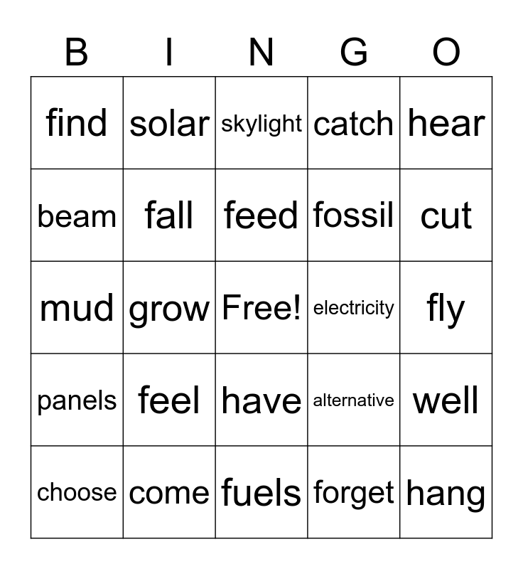 This bingo card has a free space and 27 words: alternative, energy, fossil, fuels, beam, skylight, solar, panels, electricity, well, mud, catch, choose, come, cut, dig, fall, feed, feel, find, fly, forget, grow, hang, have, hear and happen.