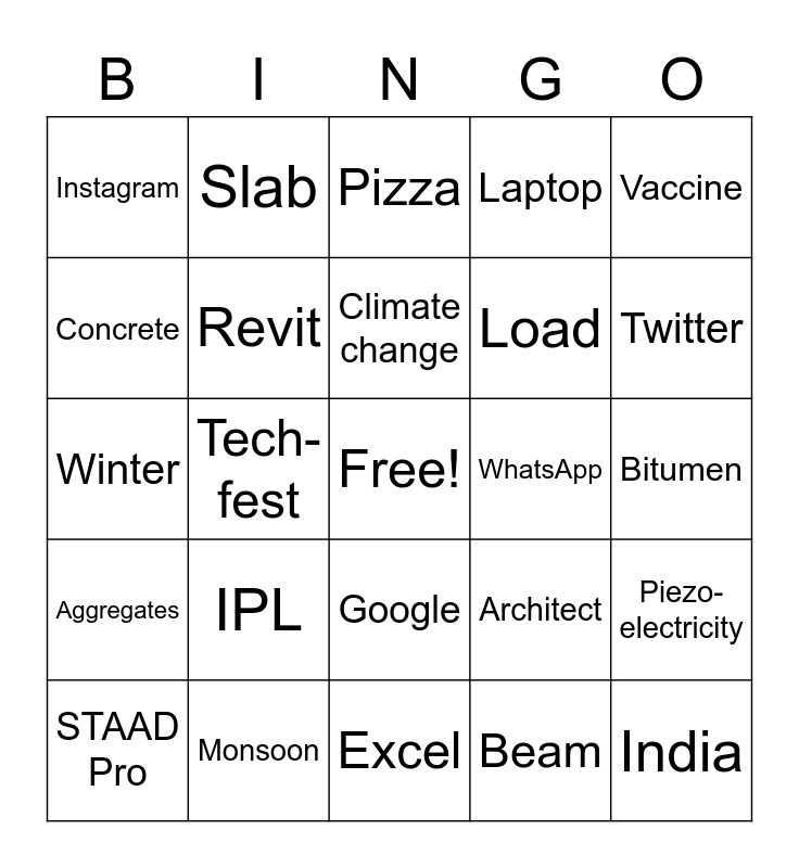 This bingo card has a free space and 37 words: Renewable, BIM, AutoCAD, Revit, Piezo-electricity, IPL, Climate change, Lockdown, Vaccine, Capomaestro, Tech-fest, Laptop, India, Bitumen, Concrete, Aggregates, Ice-Cream, Pizza, Google, WhatsApp, Instagram, Twitter, STAAD Pro, Excel, Corner, Beam, Slab, Footing, Games, Mountains, Beaches, Monsoon, Winter, Summer, Architect, Load and Design.