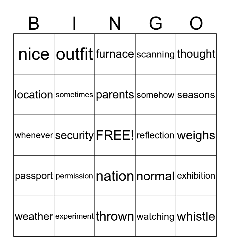 This bingo card has a free space and 24 words: permission, experiment, parents, weather, thought, nice, location, outfit, reflection, nation, somehow, whenever, normal, exhibition, sometimes, watching, weighs, furnace, seasons, security, whistle, passport, scanning and thrown.
