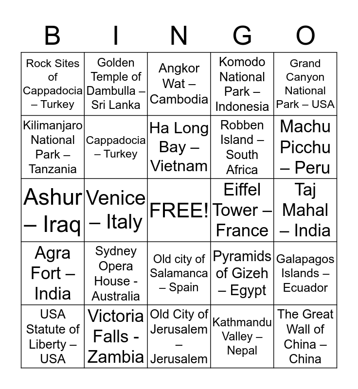 This bingo card has a free space and 24 words: Sydney Opera House - Australia, Victoria Falls - Zambia, Ha Long Bay – Vietnam, USA Statute of Liberty – USA, Grand Canyon National Park – USA, Rock Sites of Cappadocia – Turkey, Kilimanjaro National Park – Tanzania, Golden Temple of Dambulla – Sri Lanka, Eiffel Tower – France, Old city of Salamanca – Spain, Robben Island – South Africa, Ashur – Iraq, Pyramids of Gizeh – Egypt, Galapagos Islands – Ecuador, Cappadocia – Turkey, Kathmandu Valley – Nepal, Taj Mahal – India, Angkor Wat – Cambodia, Machu Picchu – Peru, Venice – Italy, The Great Wall of China – China, Agra Fort – India, Komodo National Park – Indonesia and Old City of Jerusalem – Jerusalem.