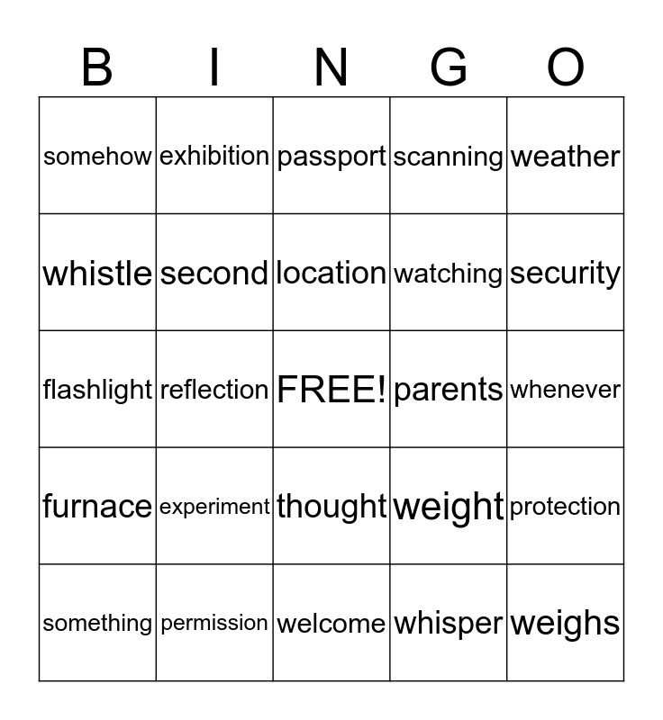 This bingo card has a free space and 24 words: experiment, permission, location, something, weather, somehow, whistle, exhibition, parents, thought, watching, flashlight, weight, protection, second, whisper, whenever, passport, security, reflection, weighs, furnace, scanning and welcome.