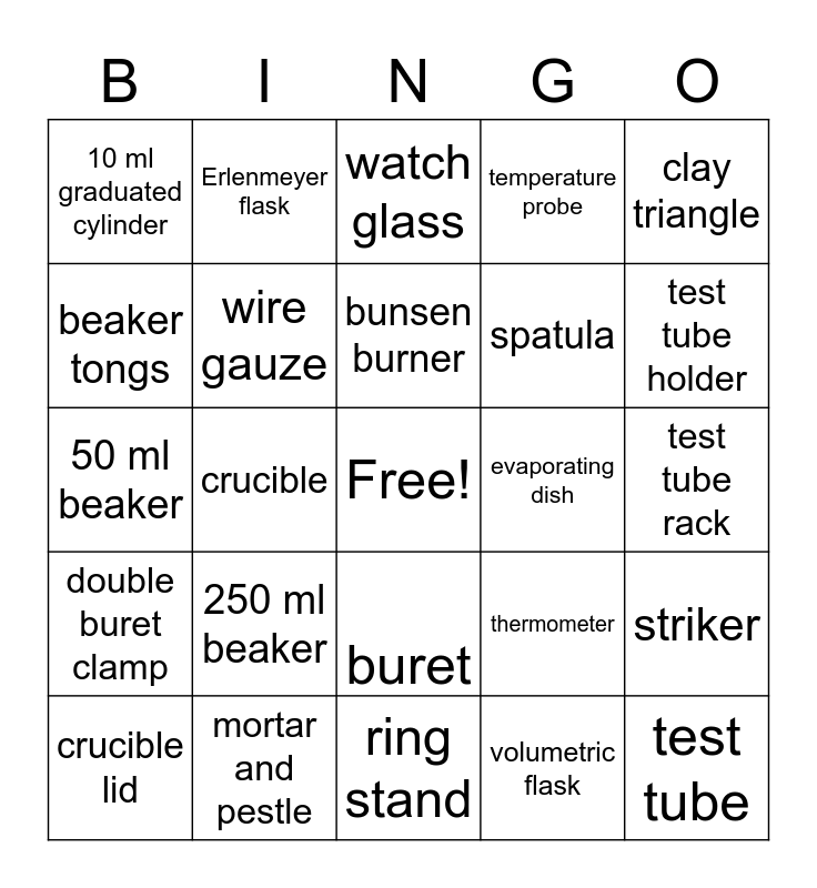 This bingo card has a free space and 25 words: 250 ml beaker, ring stand, bunsen burner, crucible lid, clay triangle, 10 ml graduated cylinder, beaker tongs, Erlenmeyer flask, evaporating dish, buret, spatula, 50 ml beaker, thermometer, striker, wire gauze, graduated cylinder, test tube rack, watch glass, test tube holder, crucible, test tube, mortar and pestle, double buret clamp, temperature probe and volumetric flask.