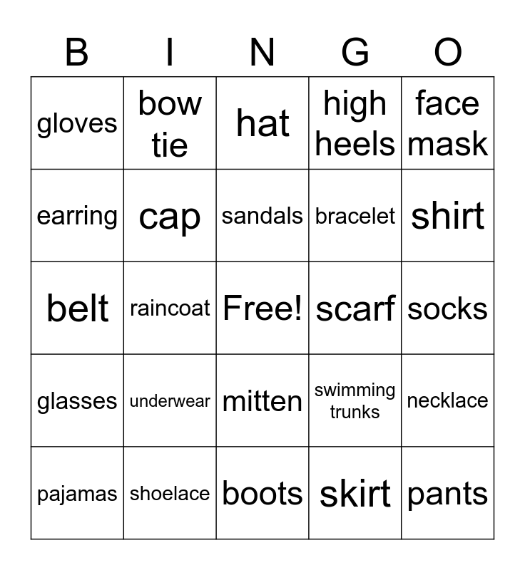 This bingo card has a free space and 30 words: shoelace, dress, raincoat, sweater, gloves, hat, cap, mitten, scarf, boots, socks, pants, skirt, tee shirt, shirt, swimsuit, swimming trunks, glasses, underwear, face mask, belt, ring, bow tie, bracelet, earring, high heels, necklace, pajamas, sandals and sunglasses.