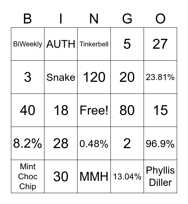 This bingo card has a free space and 24 words: 28, 30, 120, Mint Choc Chip, 27, BiWeekly, 3, AUTH, 80, 0.48%, 20, 40, 2, 96.9%, Snake, 13.04%, 15, Tinkerbell, 23.81%, 18, Phyllis Diller, 8.2%, 5 and MMH.
