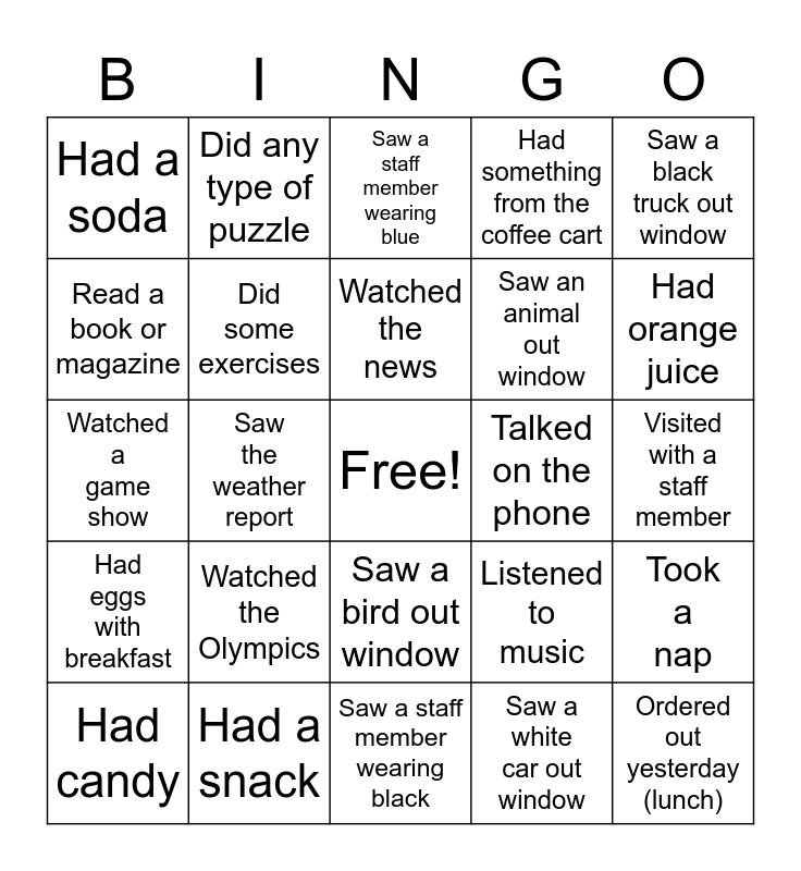 This bingo card has a free space and 24 words: Watched the Olympics, Had a snack, Watched the news, Had candy, Saw a black truck out window, Had a soda, Read a book or magazine, Did any type of puzzle, Talked on the phone, Saw a bird out window, Saw an animal out window, Watched a game show, Listened to music, Took a nap, Did some exercises, Saw a white car out window, Visited with a staff member, Saw a staff member wearing blue, Had orange juice, Saw the weather report, Ordered out yesterday (lunch), Had eggs with breakfast, Had something from the coffee cart and Saw a staff member wearing black.