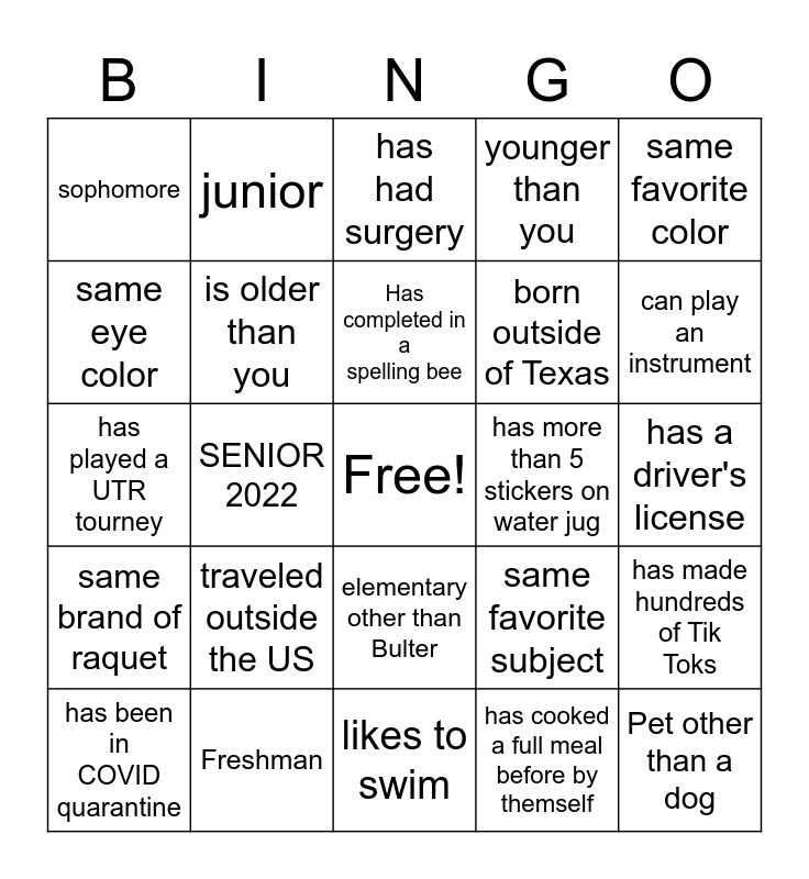 This bingo card has a free space and 24 words: traveled outside the US, Freshman, Has completed in a spelling bee, has been in COVID quarantine, same favorite color, sophomore, same eye color, junior, has more than 5 stickers on water jug, elementary other than Bulter, born outside of Texas, has played a UTR tourney, same favorite subject, has made hundreds of Tik Toks, is older than you, has cooked a full meal before by themself, has a driver's license, has had surgery, can play an instrument, SENIOR 2022, Pet other than a dog, same brand of raquet, younger than you and likes to swim.