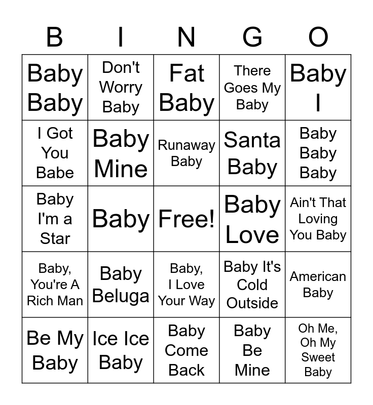 This bingo card has a free space and 29 words: Be My Baby, Baby Shark, Baby, All That She Wants (Is Another Baby), Baby Baby, Fat Baby, Baby Mine, Baby Beluga, Baby Love, Ice Ice Baby, Ain't That Loving You Baby, Oh Me, Oh My Sweet Baby, Baby Come Back, Baby Be Mine, Baby Baby Baby, Always Be My Baby, Baby, I Love Your Way, Baby, You're A Rich Man, Baby I, Baby I'm a Star, Baby It's Cold Outside, Rockabye Baby, Santa Baby, I Got You Babe, There Goes My Baby, Don't Worry Baby, American Baby, Runaway Baby and ILY (I love you Baby).
