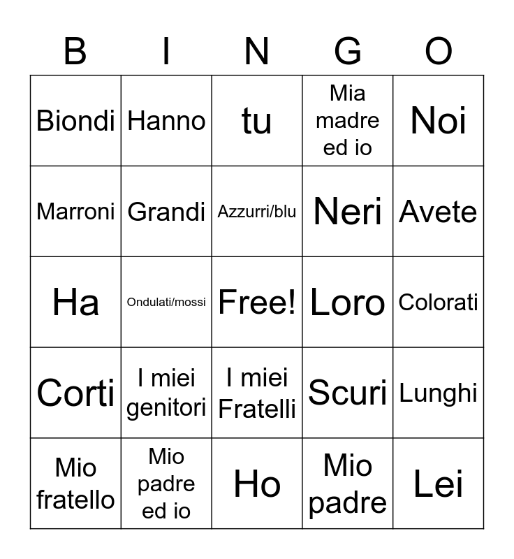 This bingo card has a free space and 44 words: Lui, Lei, Mia sorella, Mio fratello, Mia madre, Mio padre, tu, io, Noi, Mio padre ed io, Mia madre ed io, Loro, I miei Fratelli, I miei genitori, Voi, Ho, Hai, Ha, Abbiamo, Avete, Hanno, i capelli, Gli occhi, Biondi, Castani, Colorati, Neri, Rossi, Scuri, Corti, Di media lunghezza, Lunghi, A spazzola, Lisci, Ondulati/mossi, Rasati, Ricci, Scalati, Azzurri/blu, Marroni, Neri, Verdi, Grandi and Piccolo.