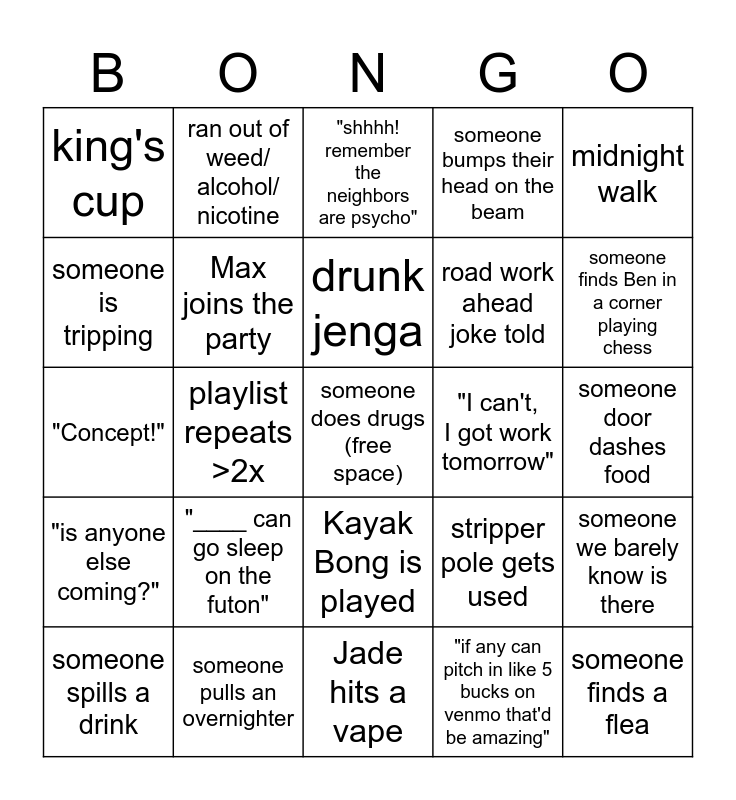 This bingo card has a free space and 24 words: "____ can go sleep on the futon", someone pulls an overnighter, drunk jenga, someone spills a drink, midnight walk, king's cup, someone is tripping, ran out of weed/ alcohol/ nicotine, "I can't, I got work tomorrow", Kayak Bong is played, road work ahead joke told, "Concept!", stripper pole gets used, someone we barely know is there, Max joins the party, "if any can pitch in like 5 bucks on venmo that'd be amazing", someone door dashes food, "shhhh! remember the neighbors are psycho", someone finds Ben in a corner playing chess, playlist repeats >2x, someone finds a flea, "is anyone else coming?", someone bumps their head on the beam and Jade hits a vape.