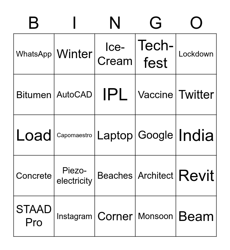 This bingo card has 38 words: Sustainable, Renewable, BIM, AutoCAD, Revit, Piezo-electricity, IPL, Climate change, Lockdown, Vaccine, Capomaestro, Tech-fest, Laptop, India, Bitumen, Concrete, Aggregates, Ice-Cream, Pizza, Google, WhatsApp, Instagram, Twitter, STAAD Pro, Excel, Corner, Beam, Slab, Footing, Games, Mountains, Beaches, Monsoon, Winter, Summer, Architect, Load and Design.