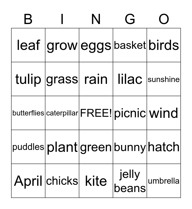 This bingo card has a free space and 24 words: plant, chicks, rain, April, birds, leaf, tulip, grow, picnic, green, lilac, butterflies, bunny, hatch, grass, jelly beans, wind, eggs, sunshine, caterpillar, umbrella, puddles, basket and kite.