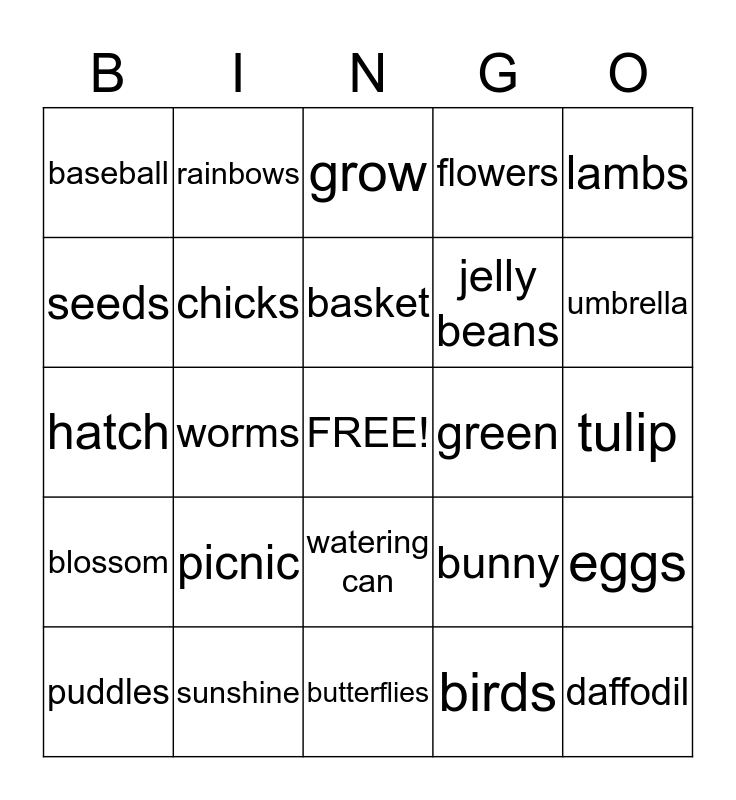 This bingo card has a free space and 24 words: picnic, sunshine, basket, puddles, lambs, baseball, seeds, rainbows, green, watering can, jelly beans, hatch, bunny, eggs, chicks, birds, tulip, grow, umbrella, worms, daffodil, blossom, flowers and butterflies.