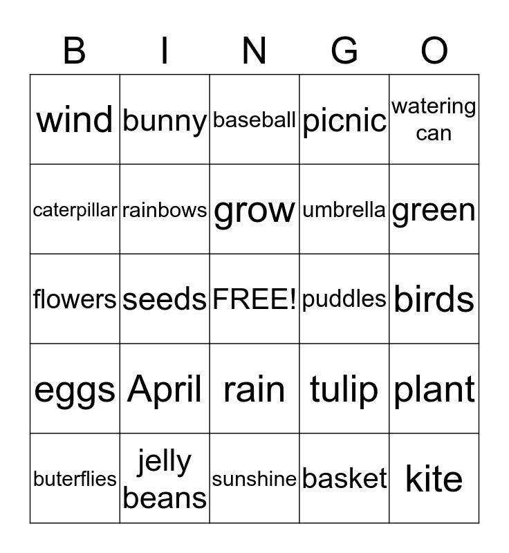 This bingo card has a free space and 24 words: April, jelly beans, grow, buterflies, watering can, wind, caterpillar, bunny, puddles, rain, umbrella, flowers, tulip, plant, rainbows, basket, birds, baseball, green, seeds, kite, eggs, picnic and sunshine.