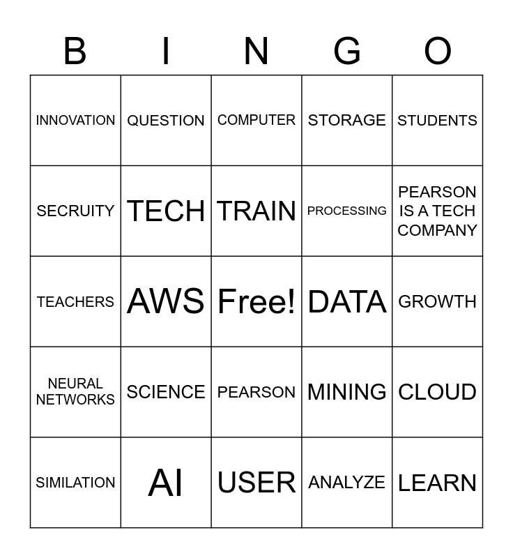 This bingo card has a free space and 30 words: AI, ML, AWS, AMAZON, INNOVATION, COMPUTER, TECH, PEARSON, DATA, USER, GROWTH, LEARN, ANALYZE, EDUCATION, PEARSON IS A TECH COMPANY, DEEP LEARNING, MINING, NEURAL NETWORKS, SCIENCE, STUDENTS, TEACHERS, CAREER, QUESTION, PROCESSING, SECRUITY, STORAGE, CLOUD, SIMILATION, TRAIN and BIG DATA.