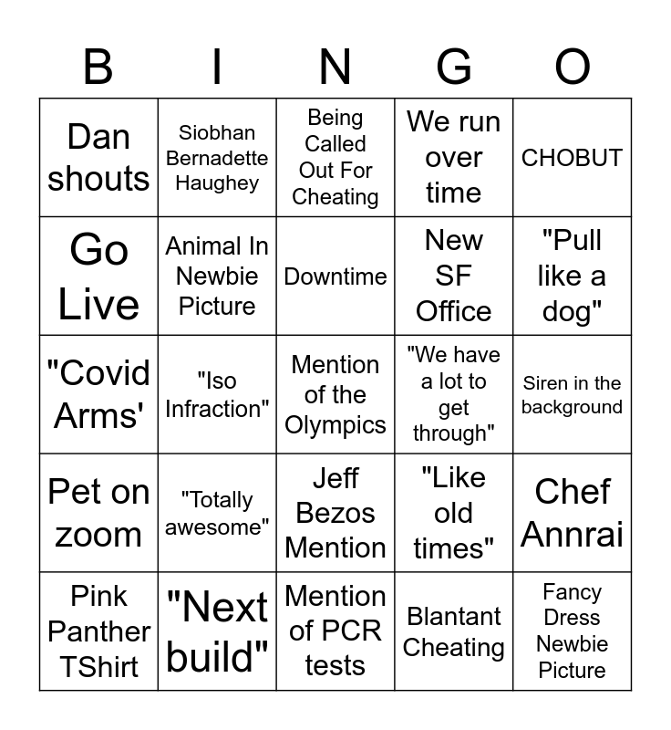 This bingo card has 43 words: Free!, Mention of the Olympics, Annrai wears a Pink Jumper, Pink Panther TShirt, "Costa Del Dublin", Blantant Cheating, Being Called Out For Cheating, Obscure literary reference, CHOBUT, "Next build", We run over time, "We have a lot to get through", Jeff Bezos Mention, "Totally awesome", Mention of Californian's in the office, Mention of PCR tests, Mention of Dave arriving in Dublin without a jacket, "Covid Arms', Dan counts down to something, "Pull like a dog", Siobhan Bernadette Haughey, Magoo, Erika gives a thumbs up, Dan shouts, covid passport, Siren in the background, "Circle Back", Name mixup, "Like old times", Pet on zoom, "Out of the Box", Chef Annrai, Dave thanks Annrai for cooking his lunch, "Iso Infraction", Staycation, Tugboat Training, Fancy Dress Newbie Picture, Downtime, Go Live, New SF Office, Drinking Our Own Champagne, Animal In Newbie Picture and Joke about competitors.