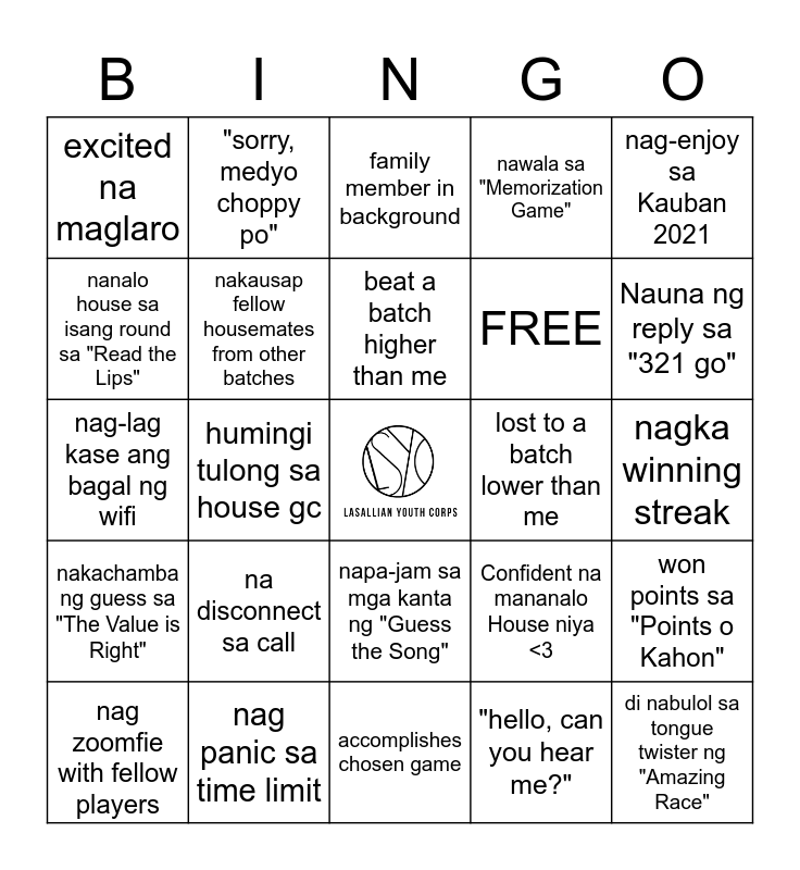 This bingo card has a free space and 24 words: nag zoomfie with fellow players, na disconnect sa call, beat a batch higher than me, "hello, can you hear me?", nag-enjoy sa Kauban 2021, excited na maglaro, "sorry, medyo choppy po", family member in background, lost to a batch lower than me, nagka winning streak, nag-lag kase ang bagal ng wifi, nakausap fellow housemates from other batches, Confident na mananalo House niya <3, won points sa "Points o Kahon", nanalo house sa isang round sa "Read the Lips", nag panic sa time limit, accomplishes chosen game, nawala sa "Memorization Game", Nauna ng reply sa "321 go", nakachamba ng guess sa "The Value is Right", humingi tulong sa house gc, napa-jam sa mga kanta ng "Guess the Song", FREE and di nabulol sa tongue twister ng "Amazing Race".