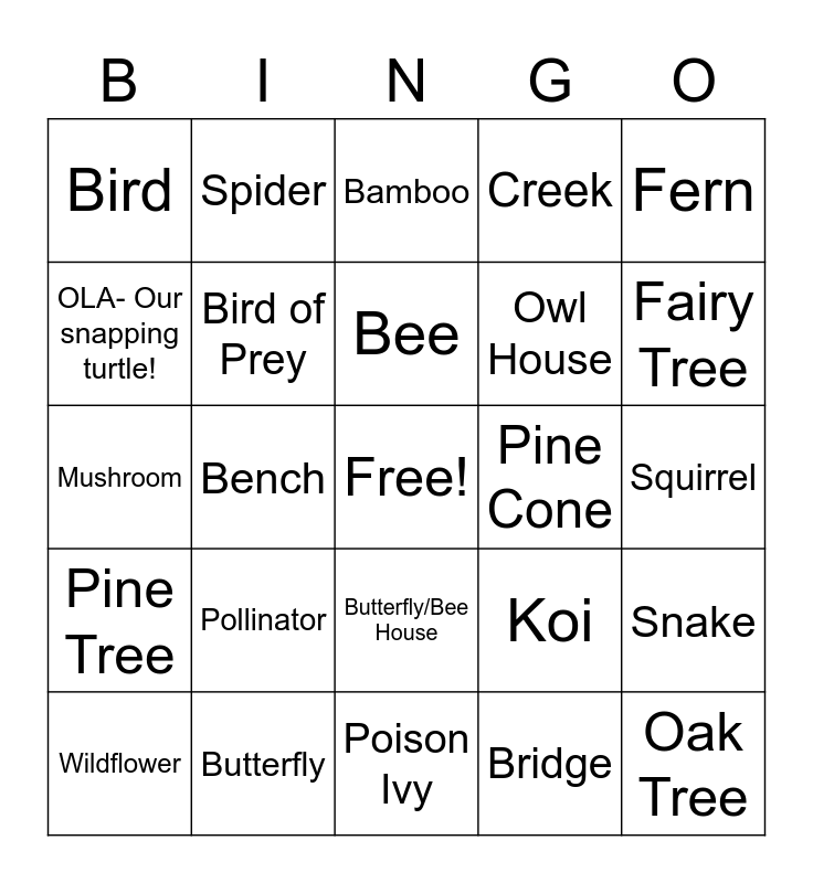 This bingo card has a free space and 24 words: Pollinator, Butterfly, Bee, Wildflower, Fern, Bird, OLA- Our snapping turtle!, Spider, Pine Cone, Butterfly/Bee House, Owl House, Mushroom, Koi, Snake, Bird of Prey, Bridge, Squirrel, Bamboo, Fairy Tree, Bench, Oak Tree, Pine Tree, Creek and Poison Ivy.