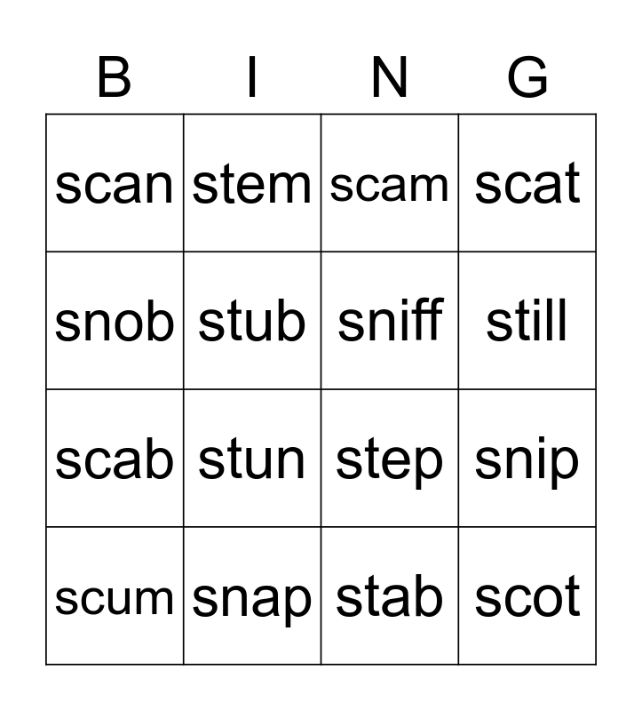 This bingo card has 16 words: snap, snip, scam, scan, scab, stem, step, stab, snob, stub, scum, scat, stun, still, sniff and scot.