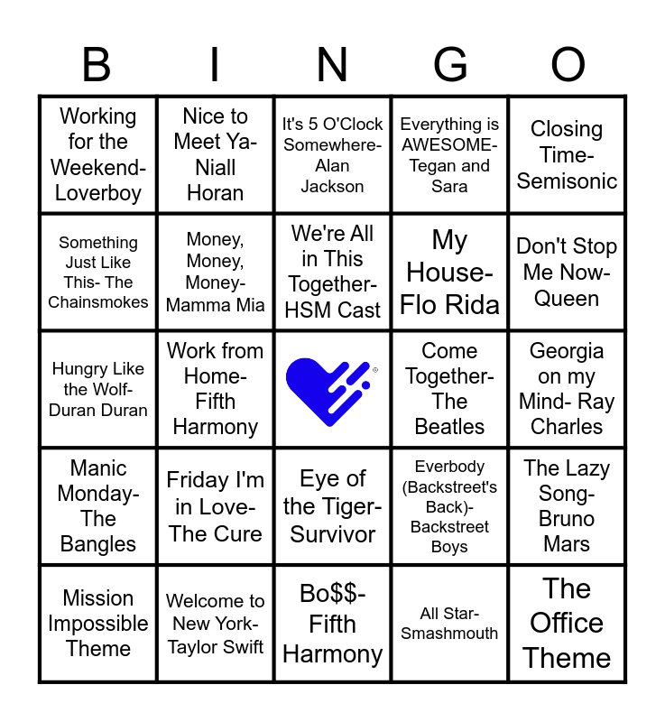 This bingo card has a free space and 30 words: Welcome to New York- Taylor Swift, Welcome to the Jungle- Guns N' Roses, Work from Home- Fifth Harmony, 9 to 5- Dolly Parton, Working for the Weekend- Loverboy, It's 5 O'Clock Somewhere- Alan Jackson, Money, Money, Money- Mamma Mia, Eye of the Tiger- Survivor, Come Together- The Beatles, Bo$$- Fifth Harmony, Georgia on my Mind- Ray Charles, The Office Theme, All Star- Smashmouth, Takin' Care of Business- Bachman Turner Overdrive, Don't Stop Me Now- Queen, Wanna Be Startin' Something'- Michael Jackson, Everbody (Backstreet's Back)- Backstreet Boys, Manic Monday- The Bangles, Friday I'm in Love- The Cure, Closing Time- Semisonic, Hungry Like the Wolf- Duran Duran, Jump- Van Halen, Nice to Meet Ya- Niall Horan, My House- Flo Rida, Something Just Like This- The Chainsmokes, Everything is AWESOME- Tegan and Sara, The Lazy Song- Bruno Mars, Mission Impossible Theme, We're All in This Together- HSM Cast and You Got It (The Right Stuff) -NKOTB.