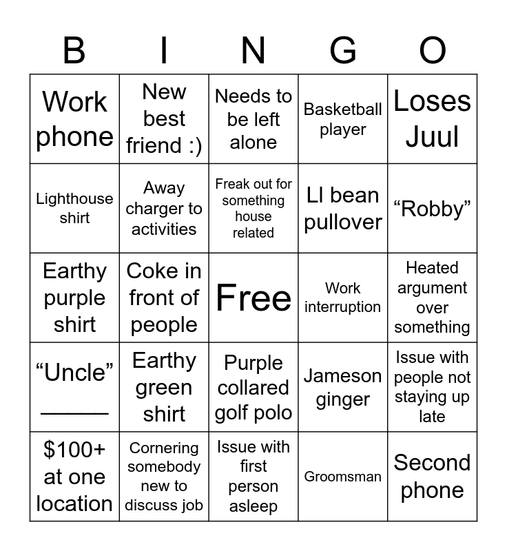 This bingo card has a free space and 24 words: Earthy green shirt, Cornering somebody new to discuss job, Freak out for something house related, $100+ at one location, Loses Juul, Work phone, Lighthouse shirt, New best friend :), Work interruption, Purple collared golf polo, Ll bean pullover, Earthy purple shirt, Jameson ginger, Issue with people not staying up late, Away charger to activities, Groomsman, Heated argument over something, Needs to be left alone, “Robby”, Coke in front of people, Second phone, “Uncle” _____, Basketball player and Issue with first person asleep.