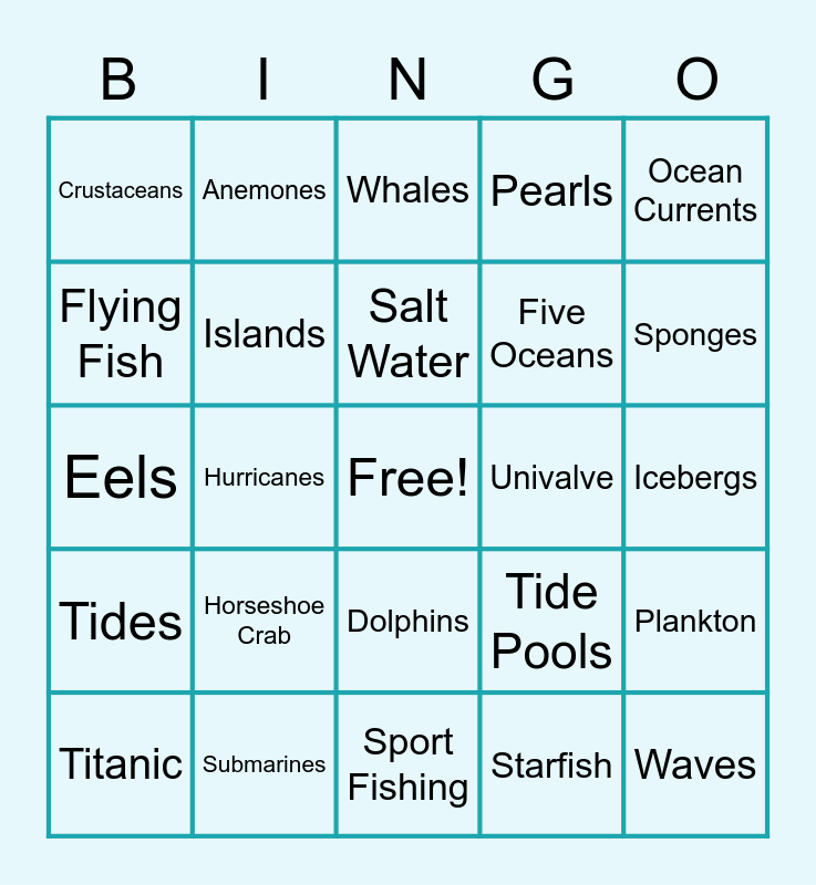 This bingo card has a free space and 42 words: Sea Turtle, Hurricanes, Sea Partners, Volcanoes, Waves, Eels, Submarines, Shore Birds, Pearls, Icebergs, Flying Fish, Horseshoe Crab, Tide Pools, Sponges, Titanic, Seahorses, Sunken Treasure, Univalve, Scuba, Crustaceans, Islands, Dolphins, Octopus, Ocean Currents, Sand Dollar, Barnacles, Whales, Jellyfish, Penguins, Tides, Coral Reef, Salt Water, Five Oceans, Plankton, Kelp, Sharks, Sport Fishing, Starfish, Bivalve, Water Cycle, Anemones and Surfing.