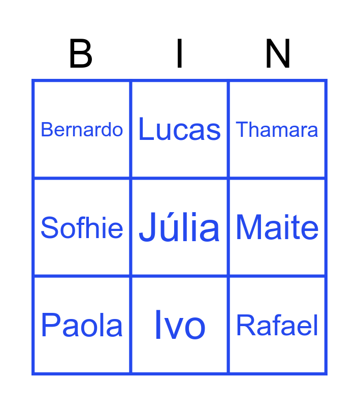 This bingo card has a free space and 26 words: Joana, André, Ivo, Mariana, Rafael, Bernardo, Maite, Lucas, Augusto, Carolina, Victor, Antonio, Matheus, Heitor, Gustavo, Rodrigo, Sofhie, Luiza, Thamara, Sara, Marcelo, Thiago, Leonardo, Leandro, Paola and Thaís.