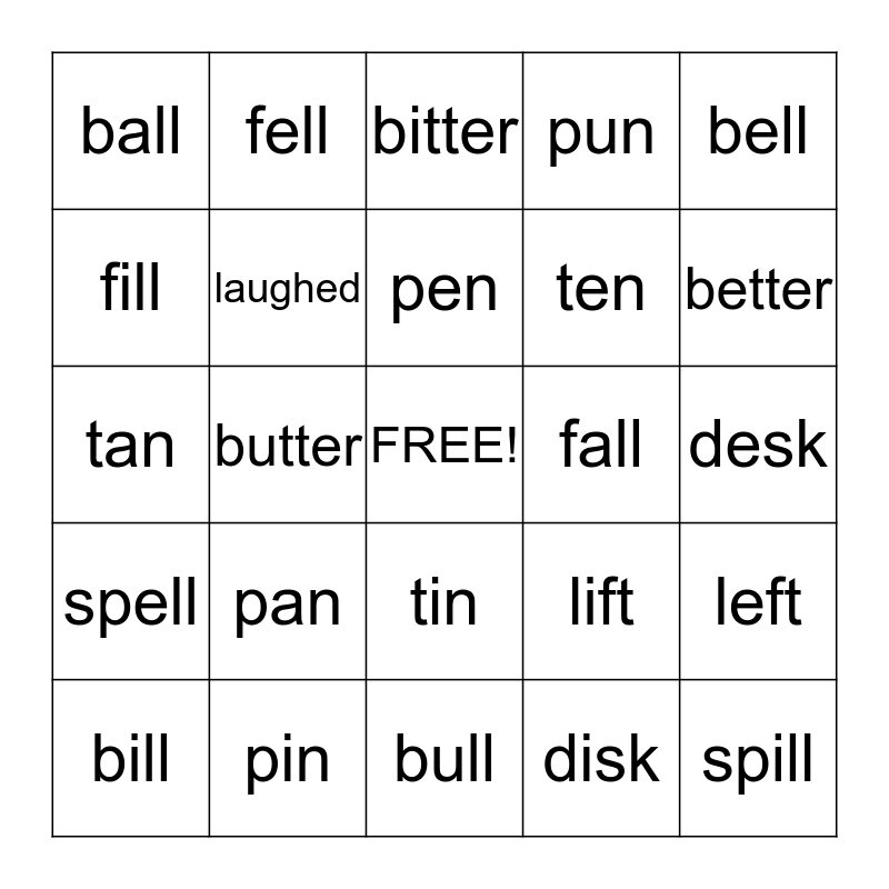 This bingo card has a free space and 24 words: pan, pin, pen, bill, bell, ball, fill, fell, fall, tin, ten, tan, lift, left, laughed, disk, desk, bitter, better, butter, spill, spell, pun and bull.