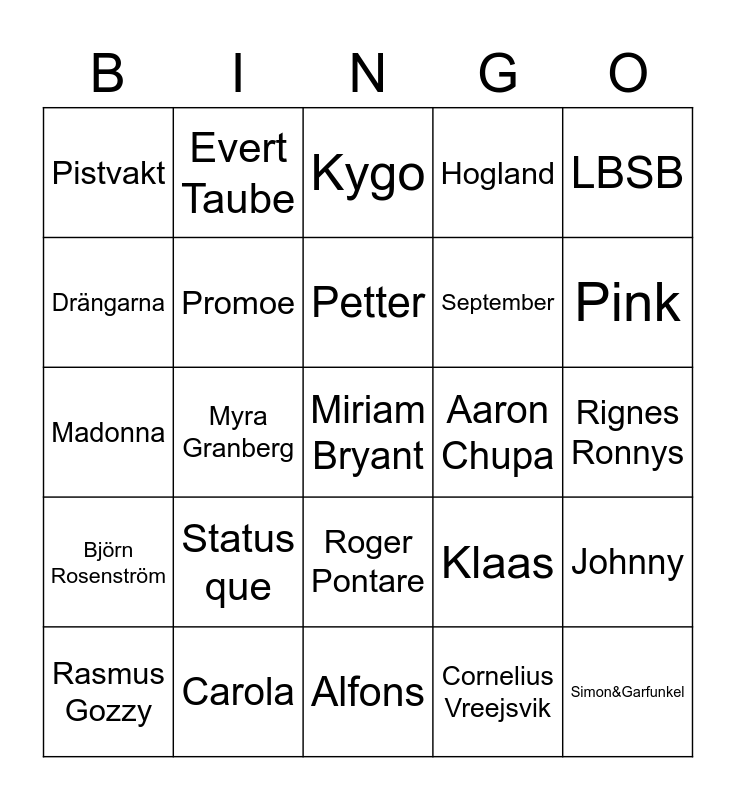 This bingo card has a free space and 24 words: Status que, Carola, Petter, Rasmus Gozzy, LBSB, Pistvakt, Drängarna, Evert Taube, Aaron Chupa, Roger Pontare, September, Madonna, Klaas, Johnny, Promoe, Cornelius Vreejsvik, Rignes Ronnys, Kygo, Pink, Myra Granberg, Simon&Garfunkel, Björn Rosenström, Hogland and Alfons.