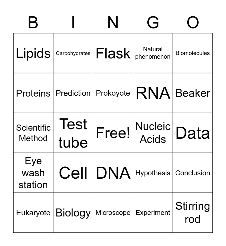 This bingo card has a free space and 24 words: Cell, Biology, Prokoyote, Eukaryote, Biomolecules, Lipids, Proteins, Carbohydrates, Nucleic Acids, DNA, RNA, Scientific Method, Hypothesis, Conclusion, Prediction, Experiment, Data, Flask, Beaker, Test tube, Stirring rod, Eye wash station, Natural phenomenon and Microscope.
