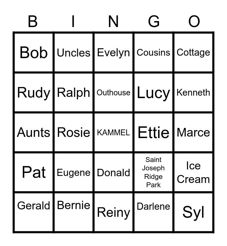 This bingo card has a free space and 29 words: Gerald, Jean, Rosie, Marian, Bob, Evelyn, Ralph, Eugene, Ettie, Bernie, Marce, Syl, Reiny, Darlene, Kenneth, Carol, Donald, Pat, Cottage, Aunts, Saint Joseph Ridge Park, Food, Lucy, Rudy, Cousins, Uncles, Ice Cream, Outhouse and Softball Game.