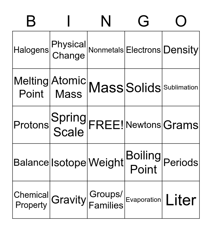 This bingo card has a free space and 41 words: Atoms, Protons, Neutrons, Atomic Mass, Gravity, Weight, Mass, Volume, Density, Balance, Spring Scale, Electrons, Liter, Grams, Newtons, Isotope, Ions, Halogens, Metals, Nonmetals, Periods, Metalloids, Groups/ Families, Solids, Liquids, Gases, Evaporation, Condensation, Sublimation, Periodic Table, Chemical Change, Physical Change, Chemical Property, Physical Property, Boiling Point, Melting Point, Freezing Point, Atomic Number, Chemical Symbol, Ruler and Thermometer.