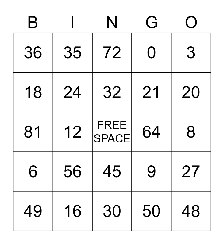 This bingo card has a free space and 24 words: 56, 16, 32, 49, 3, 36, 18, 35, 64, 45, 21, 81, 9, 27, 24, 50, 8, 72, 20, 12, 48, 6, 0 and 30.
