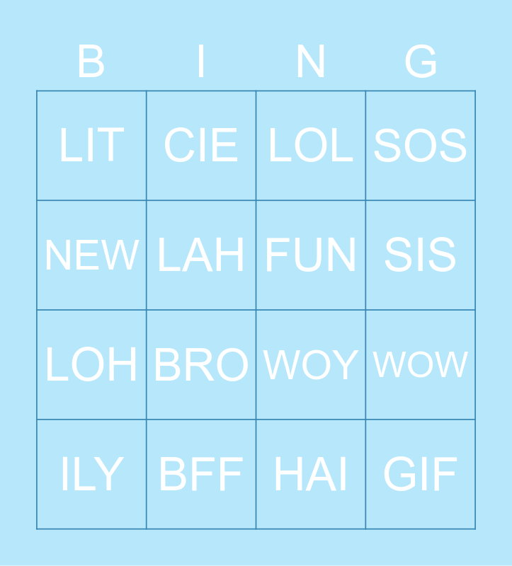 This bingo card has 16 words: BFF, WOW, LOL, LIT, LOH, CIE, WOY, HAI, NEW, LAH, ILY, SOS, BRO, SIS, FUN and GIF.