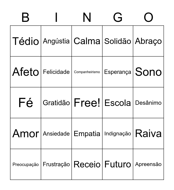 This bingo card has a free space and 36 words: PALAVRAS PARA O BINGO, Medo, Segurança, Felicidade, Indignação, Amor, Companheirismo, Saudades, Abraço, Toque, Gratidão, Solidão, Família, Escola, Sono, Tédio, Live, Ansiedade, Apreensão, Calma, Desânimo, Raiva, Frustração, Preocupação, Receio, Angústia, Fé, Incerteza, Esperança, Afeto, Solidariedade, Insegurança, Futuro, Empatia, Superação and Compaixão.