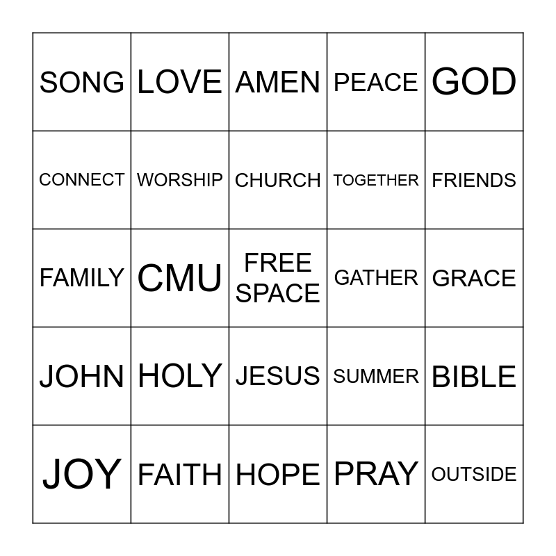 This bingo card has a free space and 24 words: HOLY, FAITH, CHURCH, JOY, GOD, SONG, CONNECT, LOVE, GATHER, JESUS, TOGETHER, FAMILY, SUMMER, BIBLE, WORSHIP, PRAY, GRACE, AMEN, FRIENDS, CMU, OUTSIDE, JOHN, PEACE and HOPE.