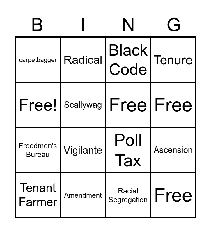 This bingo card has 16 words: Amendment, Ascension, Black Code, carpetbagger, Freedmen's Bureau, Radical, Poll Tax, Racial Segregation, Free!, Scallywag, Tenant Farmer, Tenure, Vigilante, Free, Free and Free.