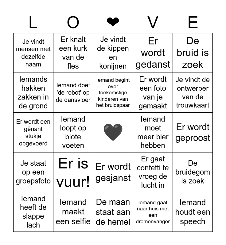 This bingo card has a free space and 75 words: Je speelt een spelletje, Iemand neemt een tweede stuk taart, Je vindt de kippen en konijnen, Iemand tikt op zijn glas voor een speech, Iemand moet de tent nog opzetten, Iemand moet zijn telefoon opladen, Er wordt uit het niets een burger aangeboden, Je vindt de moeder van de bruid, Je vindt het broertje van de bruid, Je haalt een lekker bakkie bij LekkerBakkie, Er wordt gezongen, Er wordt muziek gemaakt, Iemand begint over toekomstige kinderen van het bruidspaar, Iemands hakken zakken in de grond, Er wordt make-up bijgewerkt, Iemand loopt op blote voeten, Er komen gênante foto's voorbij, Iemand houdt een speech, Iemand laat een traan, De bruid is zoek, Er wordt een 'That's what she said'-grap gemaakt, Er wordt een gênant stukje opgevoerd, Iemand doet 'de robot' op de dansvloer, Er knalt een kurk van de fles, Er wordt gedanst, Iemand is zijn zonnebril kwijt/vergeten, Het vuur is bijna gedoofd, Iemand laat een drankje vallen, Iemand doet een radslag, Je maakt een pagina voor het gastenboek, Iemand begint over het aanzoek van het bruidspaar, "Het wordt zowaar een beetje fris.", Iemand heeft een valse bingo, Er gaat confetti te vroeg de lucht in, Je vindt de ontwerper van de trouwkaart, Er wordt een foto van je gemaakt, Iemand knoeit tijdens het eten, Er zit een beest in je drankje, Er wordt geproost, Iemand gaat naar huis met een dromenvanger, Je vindt de moeder van de bruidegom, Je vindt het nichtje van de bruidegom, Je haalt een drankje voor een ander, Oh nee, regen!, Er wordt een microfoon getest, Een foute meezinger bij het kampvuur, Iemand heeft de slappe lach, Je vindt mensen met dezelfde naam, Je maakt een foto met een wegwerpcamera, Iemand valt in slaap, Er vindt een schoenwissel plaats, Er wordt gesjanst, Je vraagt iemand ten dans, Iemand is zijn wasknijper kwijt, Iemand staat op de jurk van de bruid, Je spot een vlinder, Iemand laat een boer, Er wordt een kaartspel gespeeld, Iemand wikkelt zichzelf in een dekentje, Iemand zoekt iets op op de trouwwebsite, Er is vuur!, Iemand juicht het uit van vreugde, Iemand heeft bloemen in het haar, Er worden bellen geblazen, Iemand zoekt de koffie-kar, Iemand moet meer bier hebben, Het is lekker zonnig, Iemand heeft een aanval van 'Happy Tears', Iemand schept voor de derde keer op (Wat betreft eten, niet ego), De bruidegom is zoek, Je staat op een groepsfoto, Iemand maakt een selfie, Een onbekend persoon stelt zich voor, De maan staat aan de hemel and Iemand neemt twee verschillende stukken taart.