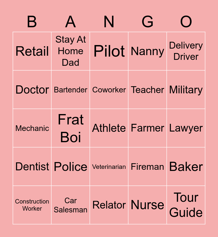This bingo card has 25 words: Police, Relator, Coworker, Construction Worker, Delivery Driver, Retail, Doctor, Stay At Home Dad, Farmer, Veterinarian, Teacher, Mechanic, Fireman, Baker, Bartender, Tour Guide, Lawyer, Pilot, Military, Frat Boi, Athlete, Car Salesman, Dentist, Nanny and Nurse.