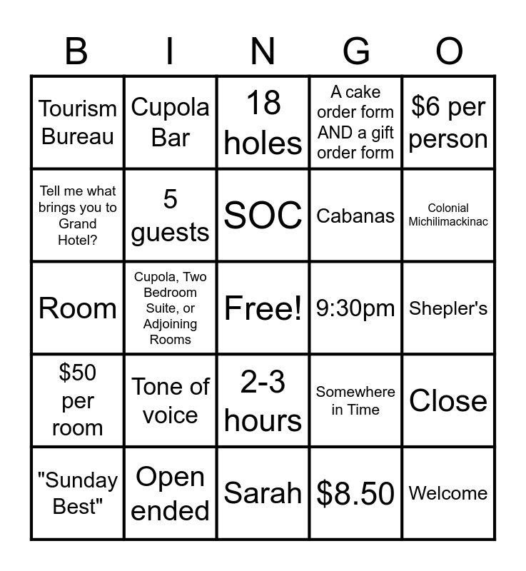 This bingo card has a free space and 24 words: Tone of voice, Open ended, SOC, "Sunday Best", $6 per person, Tourism Bureau, Tell me what brings you to Grand Hotel?, Cupola Bar, 9:30pm, 2-3 hours, Cabanas, Room, Somewhere in Time, Close, 5 guests, $8.50, Shepler's, 18 holes, Colonial Michilimackinac, Cupola, Two Bedroom Suite, or Adjoining Rooms, Welcome, $50 per room, A cake order form AND a gift order form and Sarah.
