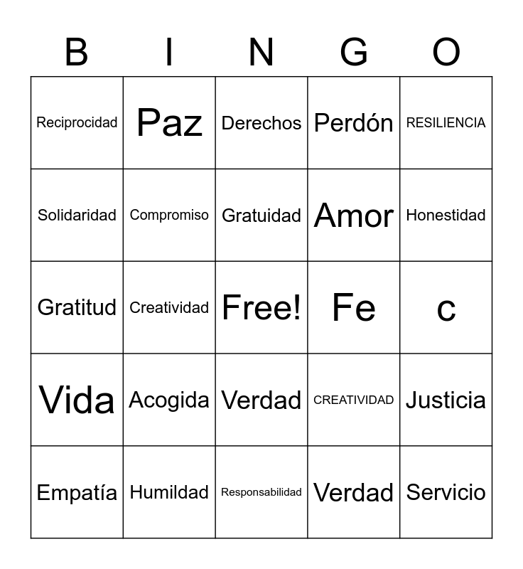 This bingo card has a free space and 28 words: Justicia, Libertad, Amor, Verdad, Solidaridad, Derechos, Paz, Vida, Fe, Empatía, Gratitud, Perdón, Humildad, Responsabilidad, Honestidad, Respeto, Acogida, Compromiso, Gratuidad, Verdad, Reciprocidad, Democracia, Servicio, Creatividad, c, CREATIVIDAD, RESILIENCIA and LIDERAZGO.