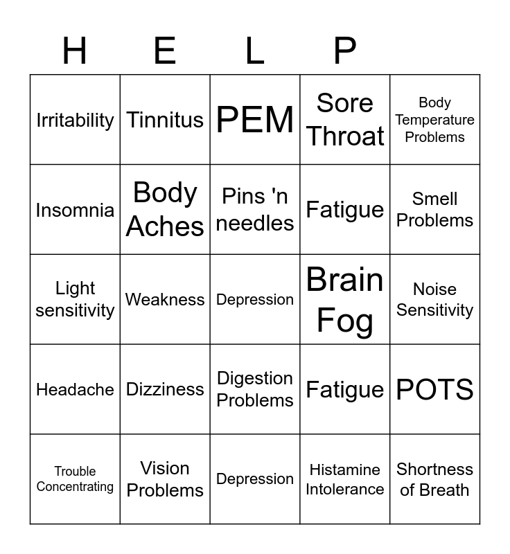 This bingo card has a free space and 27 words: Fatigue, Tinnitus, Fatigue, Depression, Insomnia, PEM, Tinnitus, Headache, Brain Fog, POTS, Light sensitivity, Sore Throat, Trouble Concentrating, Vision Problems, Smell Problems, Taste Problems, Body Aches, Pins 'n needles, Dizziness, Irritability, Noise Sensitivity, Histamine Intolerance, Weakness, Shortness of Breath, Digestion Problems, Body Temperature Problems and Palpitations.