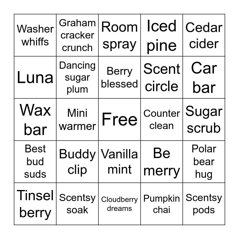 This bingo card has a free space and 24 words: Buddy clip, Scentsy soak, Berry blessed, Tinsel berry, Cedar cider, Washer whiffs, Luna, Graham cracker crunch, Counter clean, Vanilla mint, Scent circle, Wax bar, Be merry, Polar bear hug, Dancing sugar plum, Pumpkin chai, Sugar scrub, Room spray, Car bar, Mini warmer, Scentsy pods, Best bud suds, Iced pine and Cloudberry dreams.