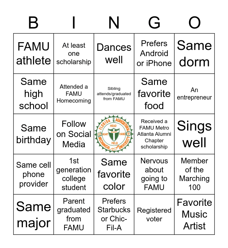 This bingo card has a free space and 24 words: 1st generation college student, Parent graduated from FAMU, Sibling attends/graduated from FAMU, Same major, Same dorm, FAMU athlete, Same high school, At least one scholarship, Received a FAMU Metro Atlanta Alumni Chapter scholarship, Same favorite color, Same favorite food, Same birthday, Nervous about going to FAMU, Member of the Marching 100, Attended a FAMU Homecoming, Registered voter, Sings well, Dances well, An entrepreneur, Follow on Social Media, Favorite Music Artist, Same cell phone provider, Prefers Android or iPhone and Prefers Starbucks or Chic-Fil-A.