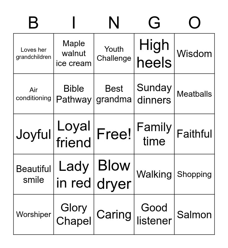 This bingo card has a free space and 24 words: Lady in red, Glory Chapel, Best grandma, Worshiper, Wisdom, Loves her grandchildren, Air conditioning, Maple walnut ice cream, Family time, Blow dryer, Sunday dinners, Joyful, Walking, Shopping, Bible Pathway, Good listener, Faithful, Youth Challenge, Meatballs, Loyal friend, Salmon, Beautiful smile, High heels and Caring.