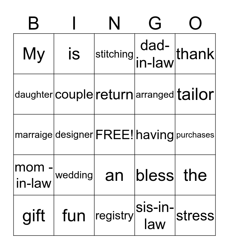 This bingo card has a free space and 25 words: wedding, registry, return, gift, thank, My, daughter, is, having, an, arranged, marraige, bless, the, couple, shopping, purchases, stitching, tailor, designer, stress, fun, mom -in-law, dad-in-law and sis-in-law.