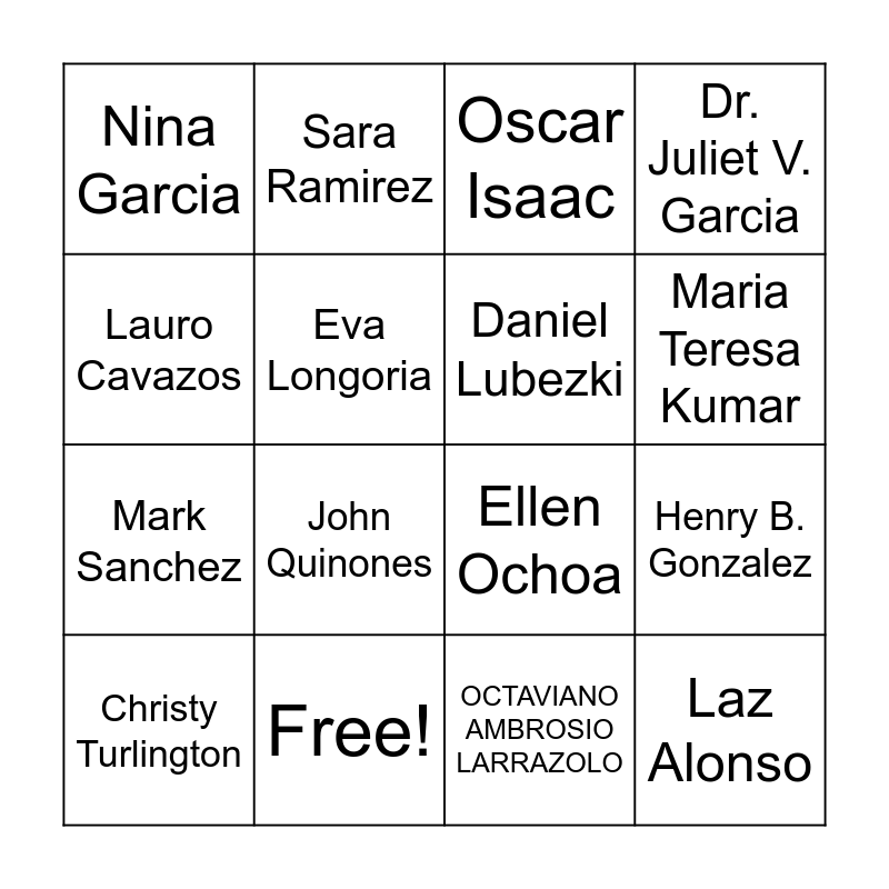 This bingo card has 28 words: Sonia Montamayor, America Ferrera, Mark Sanchez, Salma Hayek, Eva Longoria, Oscar Isaac, Sara Ramirez, Laz Alonso, Free!, Victor Cruz, Ellen Ochoa, Dr. Juliet V. Garcia, Lin – Manuel Miranda, Julian Castro, John Quinones, Ramses Alcaide, Lalo Alcaraz, Daniel Lubezki, Maria Teresa Kumar, ALFREDO QUIÑONES-HINOJOSA, Nina Garcia, Aubrey Plaza, Christy Turlington, Henry B. Gonzalez, OCTAVIANO AMBROSIO LARRAZOLO, Bobby Pulido, Lauro Cavazos and Juan Felipe Herrera.