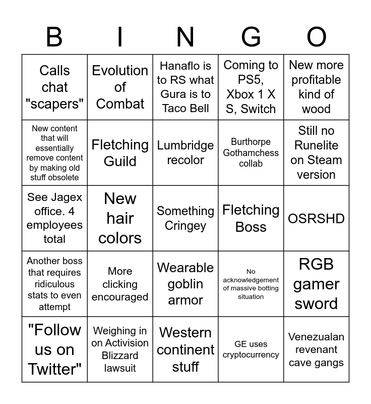 This bingo card has a free space and 24 words: More clicking encouraged, Weighing in on Activision Blizzard lawsuit, Lumbridge recolor, "Follow us on Twitter", New more profitable kind of wood, Calls chat "scapers", New content that will essentially remove content by making old stuff obsolete, Evolution of Combat, Fletching Boss, Wearable goblin armor, Burthorpe Gothamchess collab, See Jagex office. 4 employees total, No acknowledgement of massive botting situation, RGB gamer sword, Fletching Guild, GE uses cryptocurrency, OSRSHD, Hanaflo is to RS what Gura is to Taco Bell, Still no Runelite on Steam version, New hair colors, Venezualan revenant cave gangs, Another boss that requires ridiculous stats to even attempt, Coming to PS5, Xbox 1 X S, Switch and Western continent stuff.