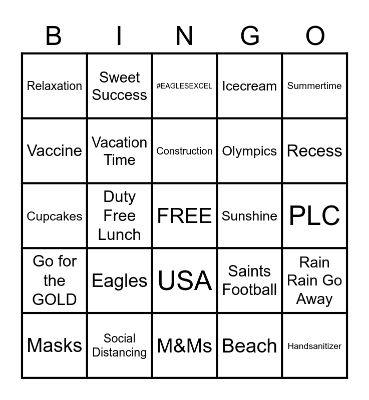 This bingo card has a free space and 24 words: Eagles, Social Distancing, Construction, Masks, Summertime, Relaxation, Vaccine, Sweet Success, Sunshine, USA, Olympics, Cupcakes, Saints Football, Rain Rain Go Away, Vacation Time, Beach, PLC, #EAGLESEXCEL, Recess, Duty Free Lunch, Handsanitizer, Go for the GOLD, Icecream and M&Ms.