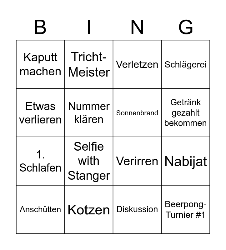 This bingo card has 16 words: Kotzen, Nabijat, Verletzen, Kaputt machen, 1. Schlafen, Tricht-Meister, Verirren, Diskussion, Etwas verlieren, Nummer klären, Anschütten, Schlägerei, Selfie with Stanger, Getränk gezahlt bekommen, Sonnenbrand and Beerpong-Turnier #1.
